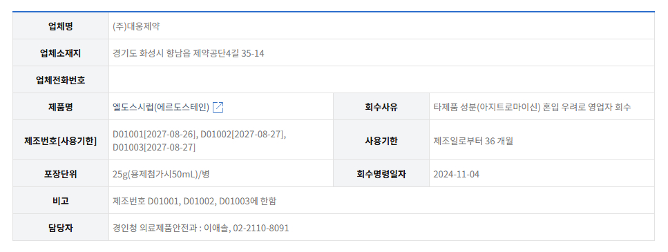 2. 일부 제조번호에서 타제품성분 (아지트로마이신) 혼입 우려로 으로 인한 영업자 회수입니다.