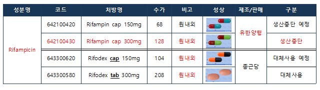 리팜핀캡슐 150mg(유한양행)도 재고 소진 후 리포덱스캡슐 150mg(종근당)으로 대체 사용 예정입니다.