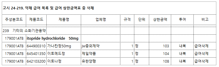 2024년 급여적정성 재평가 결과에 따라 이토프라이드 성분 전체 약품에 대한 급여 삭제가 결정되어, 2025년 2월 1일부로 해당 성분의 사용이 중단됨을 알려드립니다.